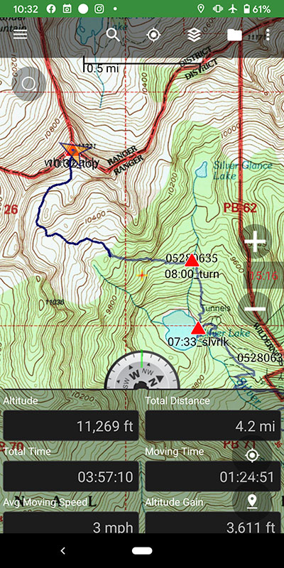 At the time, I was not aware that the route we would take was visible from the banks of Silver Lake. I later learned this route is known as the “Kirkham Route,” named after Kelly Kirkham, whom I’d just met earlier this month while climbing North Timp from Cold Fusion.