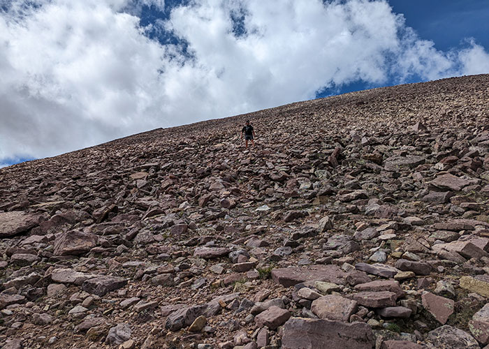 The slope angle didn’t look too bad and no one wanted to stay behind this conga line to Anderson. Boulder hopping is boulder hopping, so why not do it in the direction we needed to go anyway.