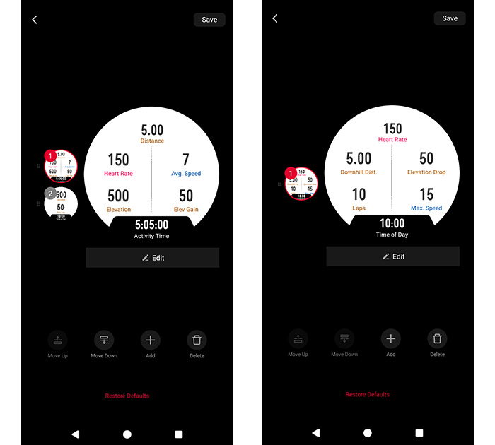 My custom screen configurations for hiking (left) vs. skiing (right)
