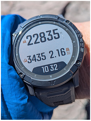 The biggest drawback I’ve run into is how easy it is to accidentally pause tracking.  I first experienced this on Day 5 of my Aconcagua expedition, trekking from Casa de Piedra to Plaza Argentina.  The touchscreen was set to Always On, and I had just put on a long-sleeved sun hoody.  When I checked my stats a while later, tracking had somehow been paused—likely from the sleeve brushing against the screen.  I was furious.  This was not the trip to have jacked-up stats.  Fortunately, I was also tracking this route with my phone, something I’ve relied on for years.  I immediately turned the touchscreen off and changed the button orientation at the same time.